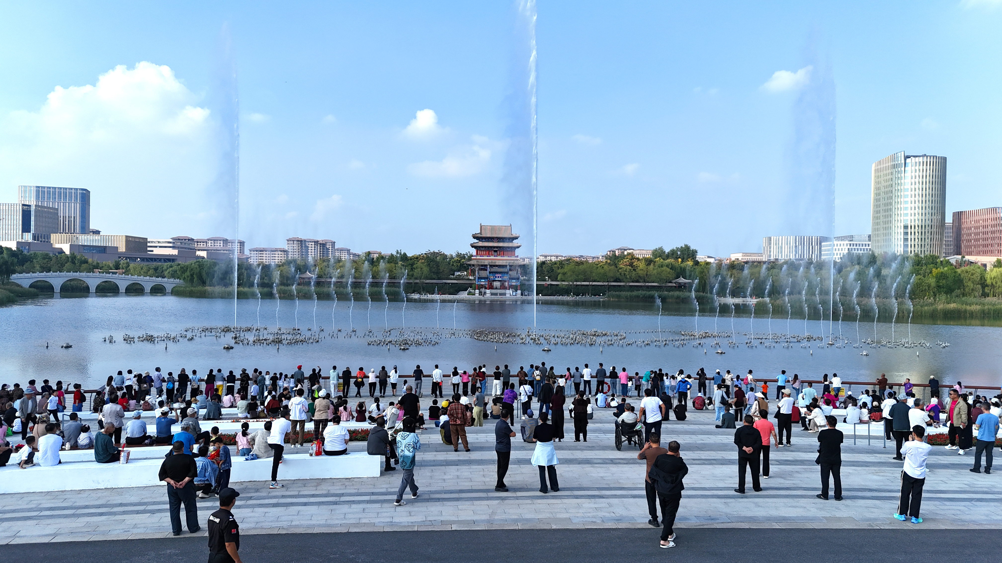 市民和游客在雄安新区金湖公园内游览(2025年10月3日摄,无人机照片)。