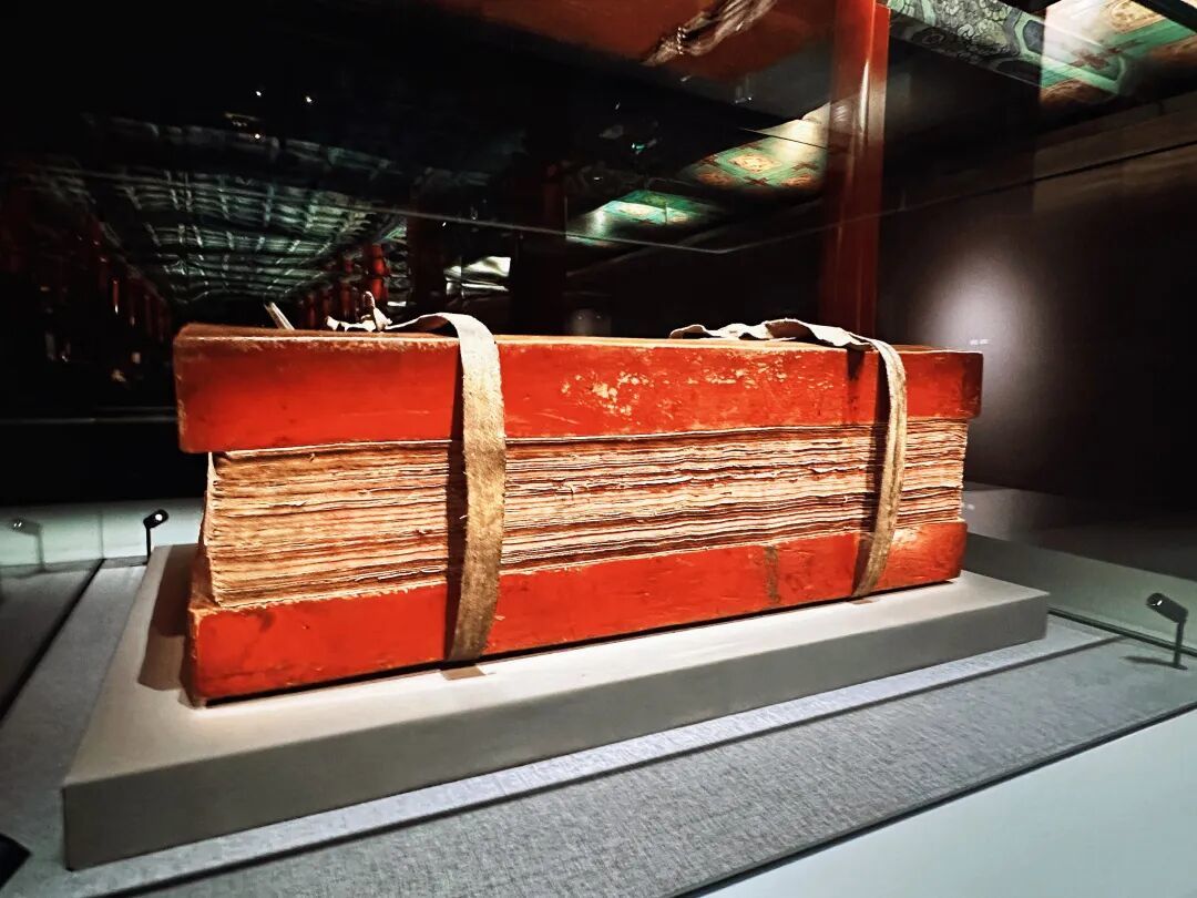 展览特意在展厅入口铺陈了一张经书墙的照片,抬头看去,层层堆叠而上的“经山”直达殿顶。萨迦寺经书墙上佛经抄本以《般若经》为主,有大、中、小三种不同尺寸,本单元展出的元代纸本墨书《般若八千颂》第pa函,是其中尺寸最大、护经板最厚的一部经书。