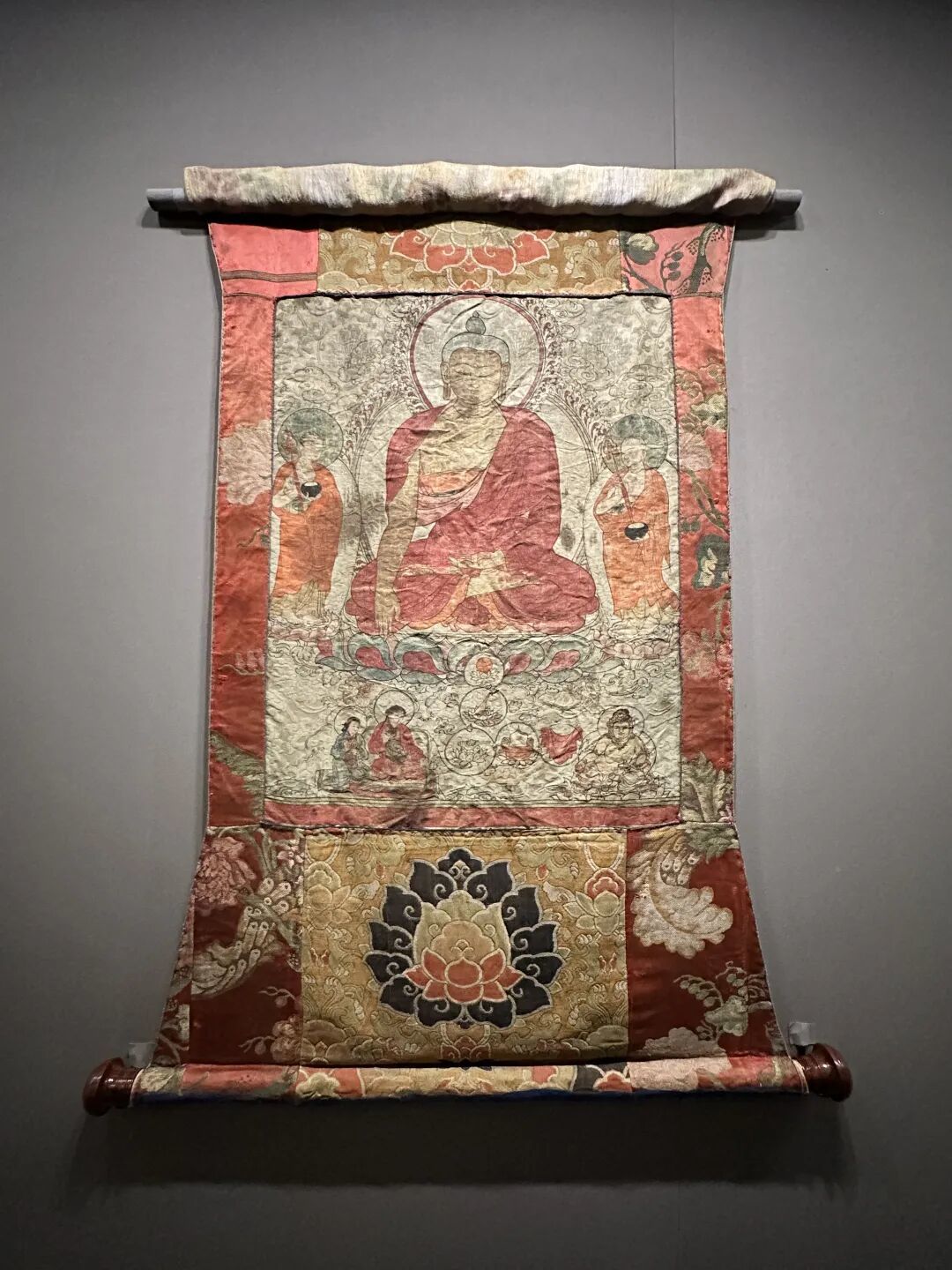 画师勉拉顿珠活跃于15世纪,是勉唐画派的创始人,他吸收汉地、尼泊尔等绘画特点,使勉唐画派成为西藏近代影响最大的绘画流派之一。勉拉顿珠署名的唐卡极其罕见,展厅内一幅萨迦寺藏由勉拉顿珠绘制的丝质唐卡“释迦牟尼佛”,描绘了释迦牟尼佛与两位大弟子,可窥见早期勉唐画派的风格。