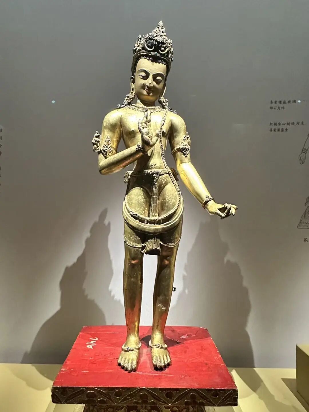 现场展出的15世纪尼泊尔菩萨造像,额头宽阔,面颊丰满,表情恬静柔美。蓝色高发髻外罩随形铜鎏金覆钵状发饰,五叶花形冠繁复华丽,宽项链独具特点。菩萨由红铜实心铸造,打磨光滑,鎏金明亮,肩宽腰细,双腿修长,身姿挺拔。