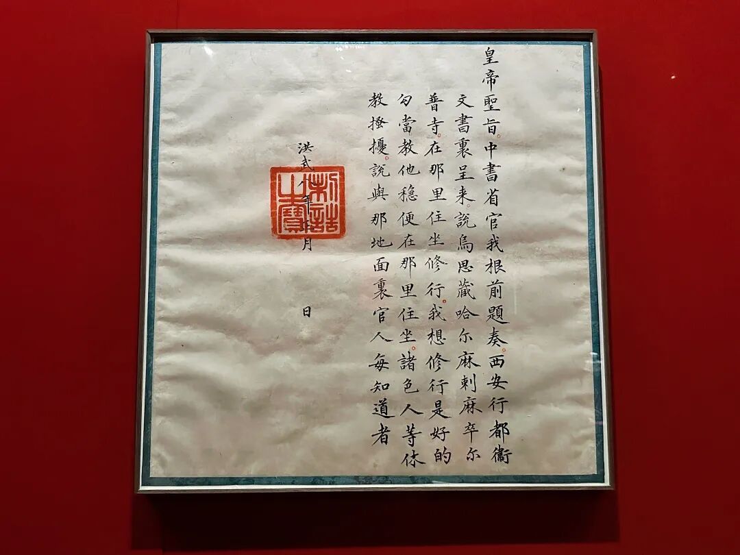 此次展览中,还有一幅由故宫博物院藏的纸本墨书,它是一道皇帝圣旨。这道圣旨于洪武八年(1375年)颁发,明太祖朱元璋得知四世噶玛巴乳必多吉在拉萨北部专心静修,特颁旨要求地方官民不要打扰。圣旨语言风格具有元代白话特点,反映出明朝立国之初就已经对西藏地方宗教势力有较为深入的接触。
