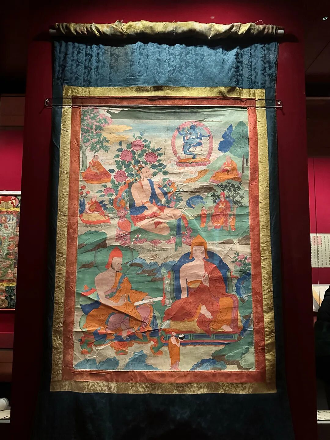 一步入展厅,唐卡“萨迦祖师三尊像”特别引人注意,画面中心的主尊为印度大成就者那若巴,瑜伽士装扮,周围环列四任萨迦法王。唐卡用色淡雅,青绿山水与透明头光的画法,显示出汉地绘画风格影响。