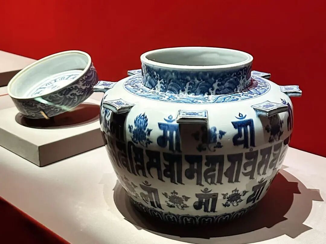 本单元内有一件展品曾是乾隆帝的收藏之一,还在《是一是二图》中出过镜,它就是“青花兰札体梵文出戟法轮盖罐”。明朝宣德年间,随着文明的发展,不同民族文化不断交融碰撞,这件青花瓷突破了传统纹样,整体以青花书梵文种子字为主要装饰,同时在肩部还有八个出戟造型,更是彰显出与众不同。