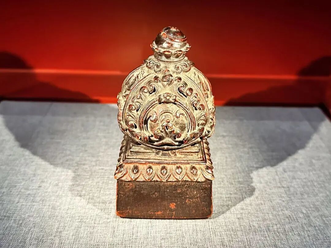 展厅中央展出的“大朝国师统领诸国僧尼中兴释教之印”,是目前唯一能确认的八思巴用印,印文为八思巴文篆书。“大朝”是指元朝建立前的蒙古汗国,1260年忽必烈即蒙古大汗位,封八思巴为国师,赐玉印,统领释教。现场展出的是根据原玉印形质和印文复制的一枚木印,供日常使用。