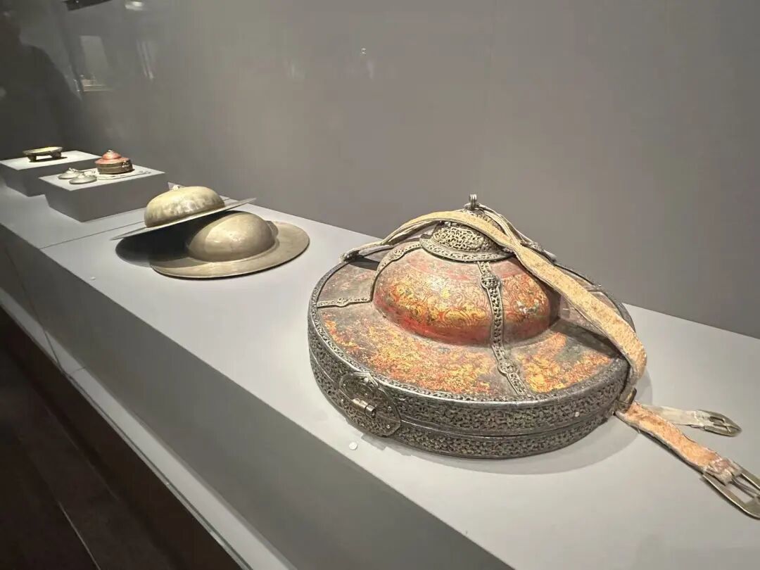 展厅左侧的展墙上展示出了一张萨迦寺普巴金刚法会使用铙钹场景的照片,下方陈列着一件明永乐年间制造的黄铜铙钹。铙钹质地光滑,隆起的“帽”沿处,錾刻有汉文款识“大明永乐年造”。铙钹是一种铜质打击乐器,由两片中间隆起的圆形镲叶组成,演奏时相击发声,多用于民间鼓乐、佛教仪轨、戏曲伴奏及合奏。